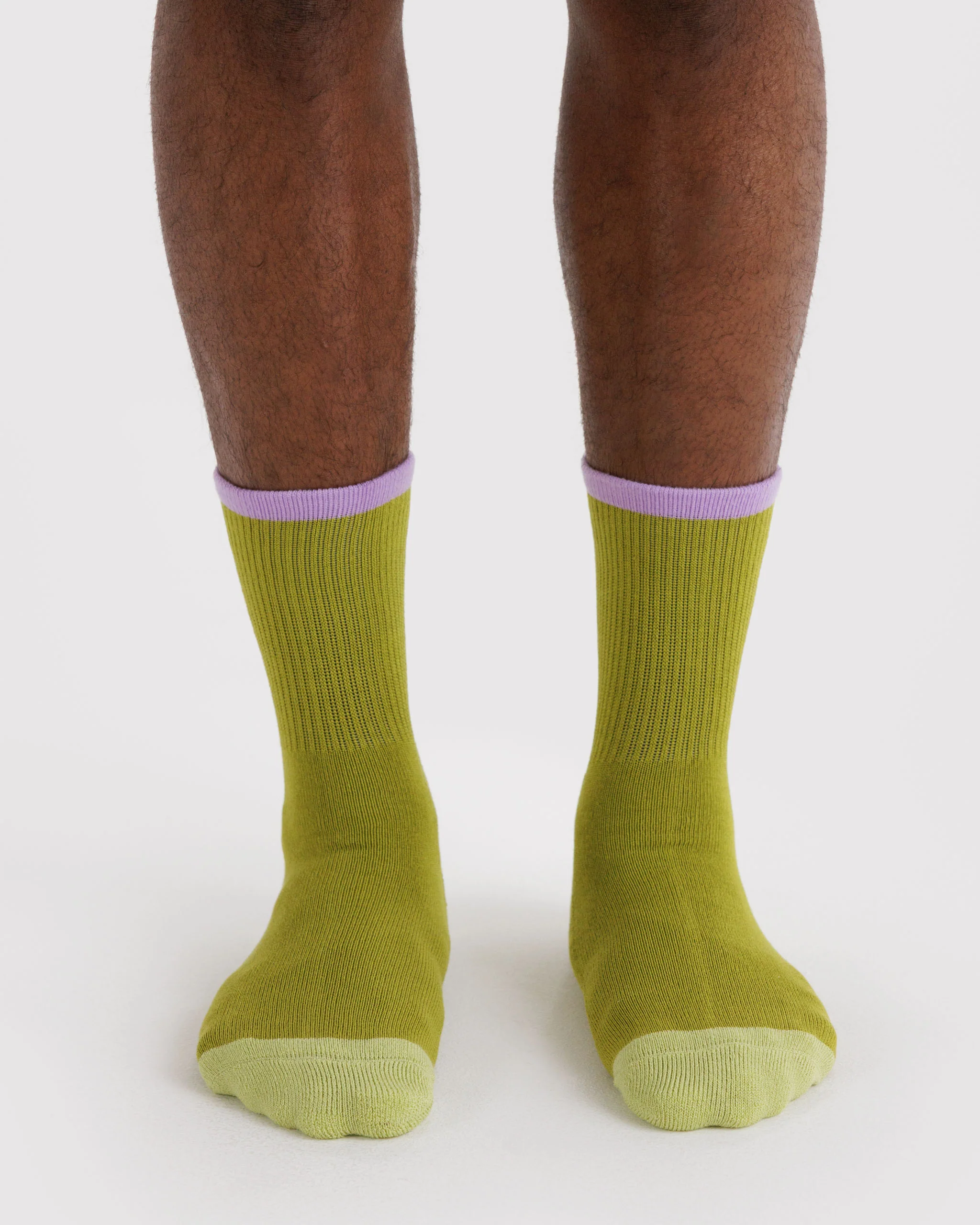 The Ribbed Socks in Olive by BAGGU are soft, stretchy, thick and colourful with a looped footbed for extra comfort - a real treat for your feet! Featuring contrasting lilac detailing. Sure, Baggu is a bag company, but isn't a sock just a knitted bag for your foot anyway?