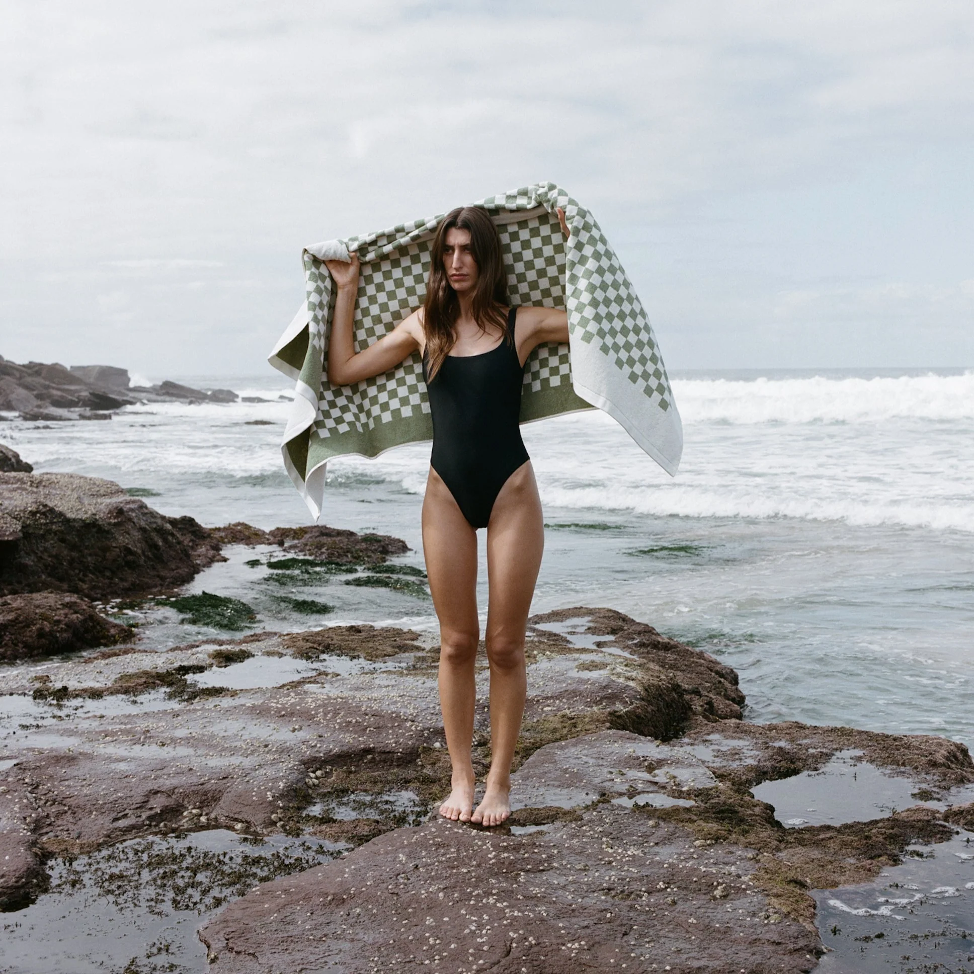 Roman Pool Towel in Sage & Chalk by luxury towelling brand, BAINA. This playful towel in checkerboard print is synonymous with the BAINA brand & features a reversible colourway. The sage checkerboard contrasting with the chalk makes a subtle statement in any bathroom or on any beach. Pairs nicely with the Beppu Bath Mat or Josephine Hand Towel.