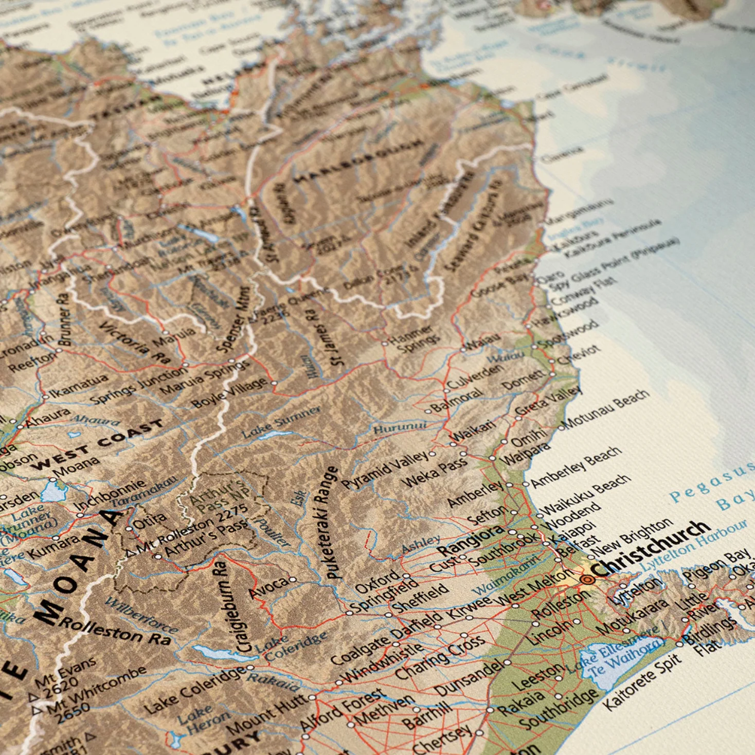Take in the majestic form of the Land of the Long White Cloud with the Canvas Map of Aotearoa/New Zealand. Meticulously designed by a cartographer, this awe-inspiring map uses natural hues and shading to depict the detailed topography and bathymetry taking in the stunning natural formations of a land steeped in history.