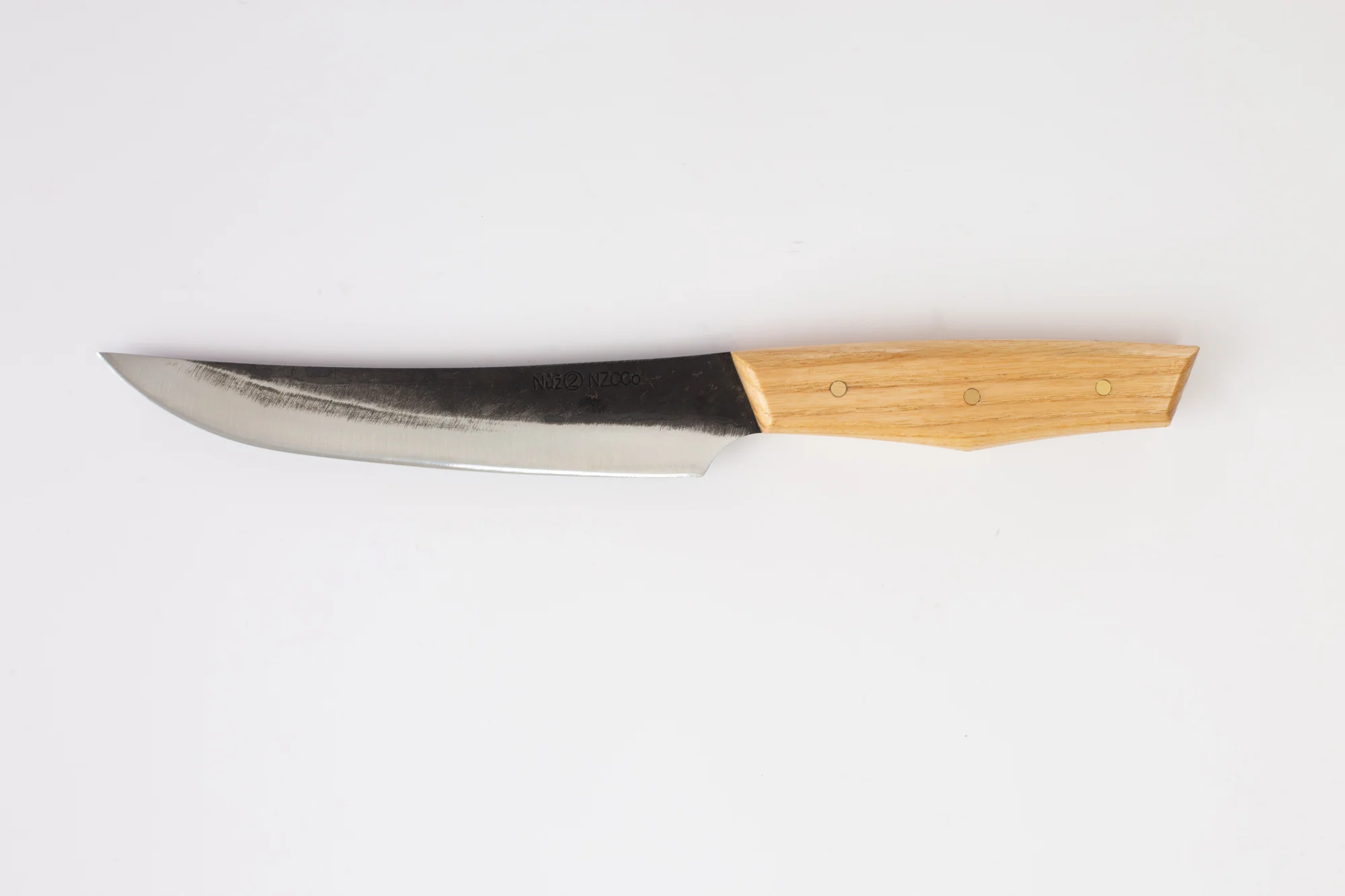 The No. 2 knife is made from Swedish carbon steel, produced from recycled saw blades. The handle is crafted from sustainably sourced American Ash wood. Three brass rivets hold together the blade and the handle producing a simple design to suit any kitchen. Individually crafted and guaranteed against faulty craftsmanship.