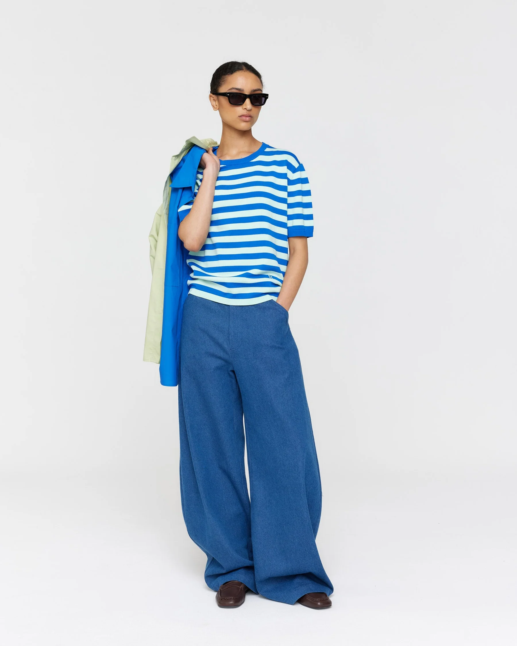 Expertly crafted with high-quality viscose nylon material, the Francisco Knit Tee by Ricochet offers exceptional comfort and design. Its crew-neck and horizontal stripe design add a stylish touch to this must-have knitted tee. Elevate your wardrobe with this expertly crafted piece in Mint & Cobalt.